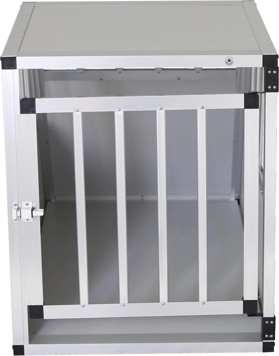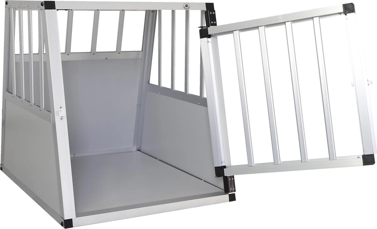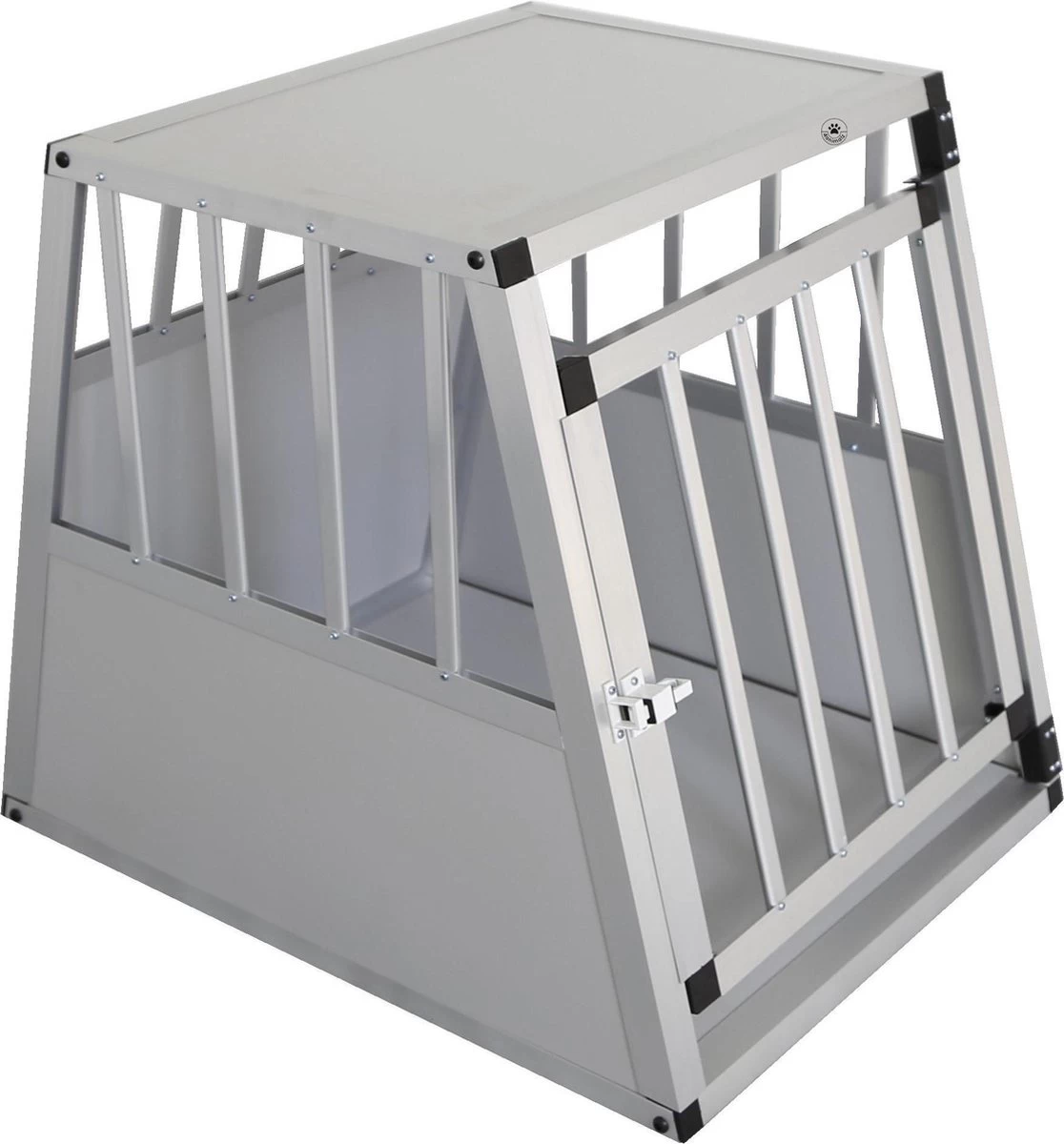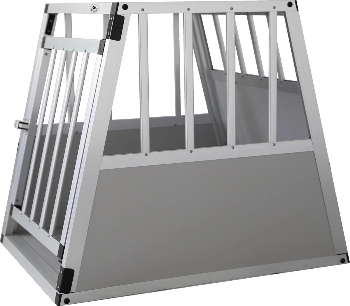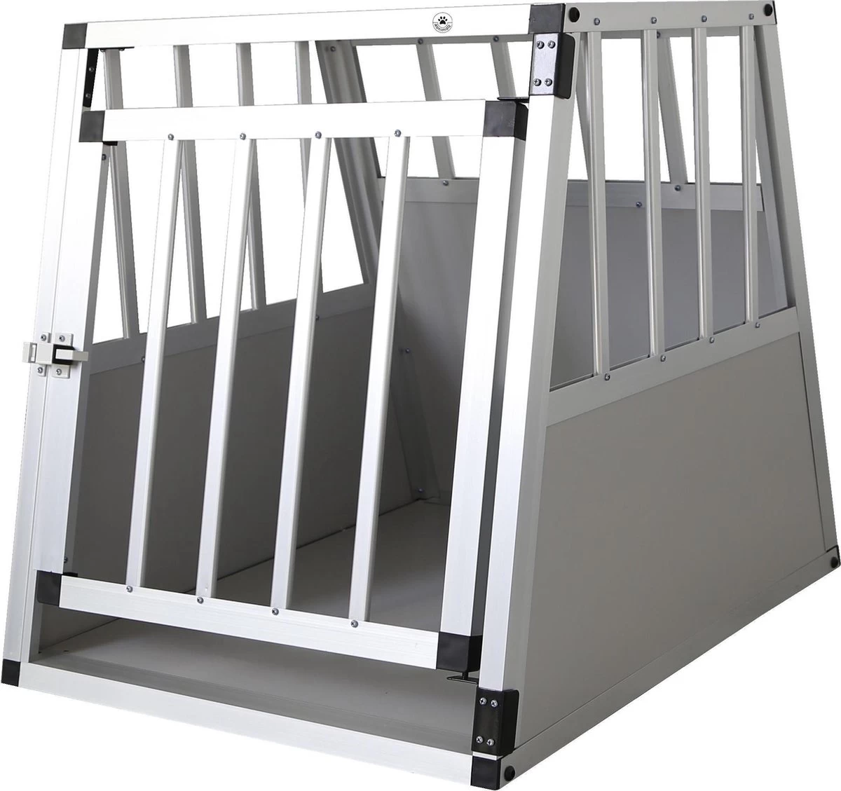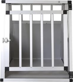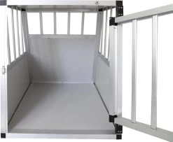 Zilveren aluminium Autobench, afmeting 69x54x60 cm met 1 deur en hierdoor geschikt voor kleine tot middelgrote honden. Afgeschuind aan voor en achterzijde voor efficiëntere ruimte benutting in de auto. Vervoer uzelf en uw hond of kat veilig in de auto in deze autobench. Een bench laat uw hond toe de omgeving in de gaten te houden zonder de bestuurder te storen.