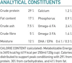 Acana Classics Wild Coast Acana Wild Coast bereid met duurzaam gevangen vis, gevangen vis, gevangen bij North Vancouver Island en vervoerd naar onze keuken vers en heel, en daardoor rijk aan natuurlijke voedingsstoffen en smaak.Vrij van hoog glycemische granen, is Acana rijk aan voedende vis eiwitten en omega-3 vetzuren om top conditie te stimuleren. Voedingsadvies: Gewicht hond (kg) Niet-actief (gr/dag) Actief (gr/dag) 2 40 60 5 60 120 10 120 180 20 200 300 30 270 420 40 330 510 50 400 600 60 450 690 Samenstelling: Haring meel (24%), Gesneden haver (23%), Verse hele haring (10%), Verse hele bot (6%), Haring olie (6%), koudgeperste canola olie, Verse hele zilver heek (4%), Hele rode linzen, Hele groenen erwten, Hele groenen linzen, Hele garbanzo bonen, Hele gele erwten, Hele haver, Zon gedroogde alfalfa, Linzen vezel, Gedroogde bruine zeewier, Verse pompoen, Verse butternut squash, Verse pastinaak, Verse groene boerenkool, Verse spinazie, Verse wortelen, Verse Red Delicious appels, Verse Bartlett peren, Gevriesdroogde haring (0.1%), Verse cranberries, Verse bosbessen, Cichoreiwortel, Kurkuma, Mariadistel, kliswortel, Lavendel, heemst wortel, rozenbottels. Analytische bestanddelen: Ruw eiwit 29 %, Ruw vet 17 %, Ruwe as 7.5 %, Ruwe celstof 5 %, Vocht 12 %, Calcium 1.1 %, Fosfor 0.9 %, Omega-6 vetzuren 2.4 %, Omega-3 vetzuren 1.4 %, DHA / EPA 0.4 % / 0.3 %. Glucosamine 700 mg/kg. Chondroitine 900 mg/kg Toevoegingen: Tocoferol rijk extract van natuurlijke oorsprong. Nutritionele toevoegingen: Vitamine A: 7500IU, Vitamine D3: 500IU, Vitamine E: 100IU, choline chloride: 500mg, E6 (Zink): 100 mg, Vitamine B5: 12,5. Zoötechnische toevoegingen: Enterococcus faecium NCIMB10415: 600×10 ^ 6 UFC. Verkrijgbaar in: 340 gr, 2 kg, 6 kg, 11,4 kg en 17 kg.