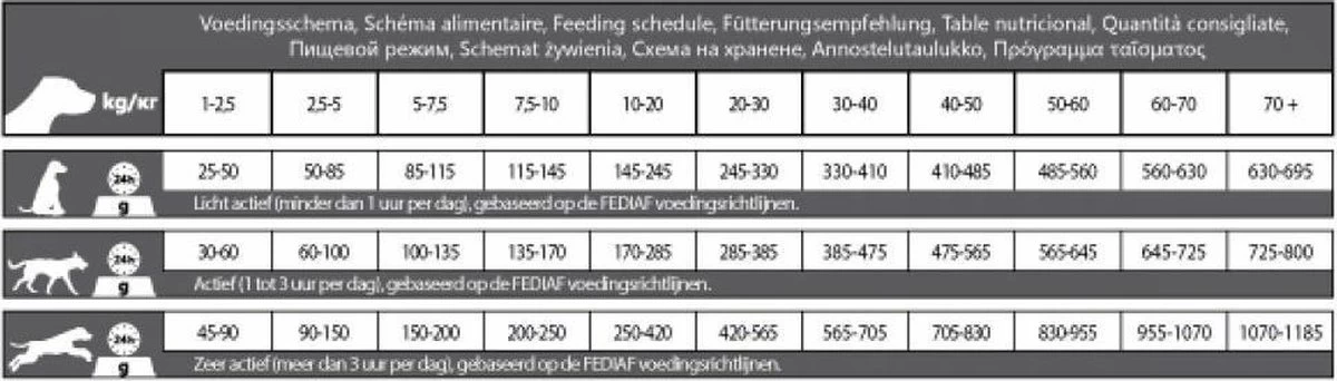 | Voedingswaarde | Rijst, maïs, gedroogd kippenvlees, gerst, dierlijk vet, lijnzaad, bietenpulp, vitamines, mineralen, sporenelementen, gedehydreerde kippenlevers, lecithine, vobra-mix (tocopherol) |