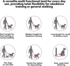 De riem heeft 2 musketons, een lengte van 2 meter en kan naar verschillende lengtes ingekort worden. De riem kan dus gebruikt worden voor het begeleiden van 2 honden, voor de dagelijkse wandeling of voor oefen- en trainingssituaties. Door de 2 musketons kan deze riem goed gecombineerd worden met een Halti Harness. De riem is van textiel en ligt prettig in de hand.
