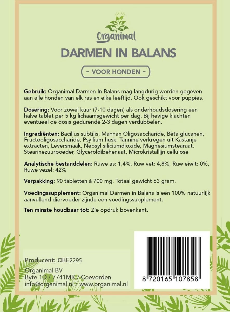 Organimal Darmen – In Balans is uitermate geschikt voor langdurig gebruik. Echter, wanneer er een noodzaak is tot langdurig gebruik duidt dat ook op een structurele onbalans bij uw hond. In dat geval raden wij u aan om in aanvulling op Darmen – In Balans, de oorzaak te onderzoeken. Zowel fysieke als mentale oorzaken kunnen de reden zijn van diarree. Een dierenarts kan u eventueel hierbij helpen. Bij heftige diarree mag de dosis gedurende 2-3 dagen worden verhoogd naar 2 keer per dag in plaats van 1 keer per dag.