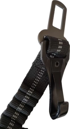 Doordat het bevestigingssysteem bestaat uit een haak en een kliksysteem, past de gordel in alle auto’s en kun je de hondenriem overal in de wagen vastmaken.