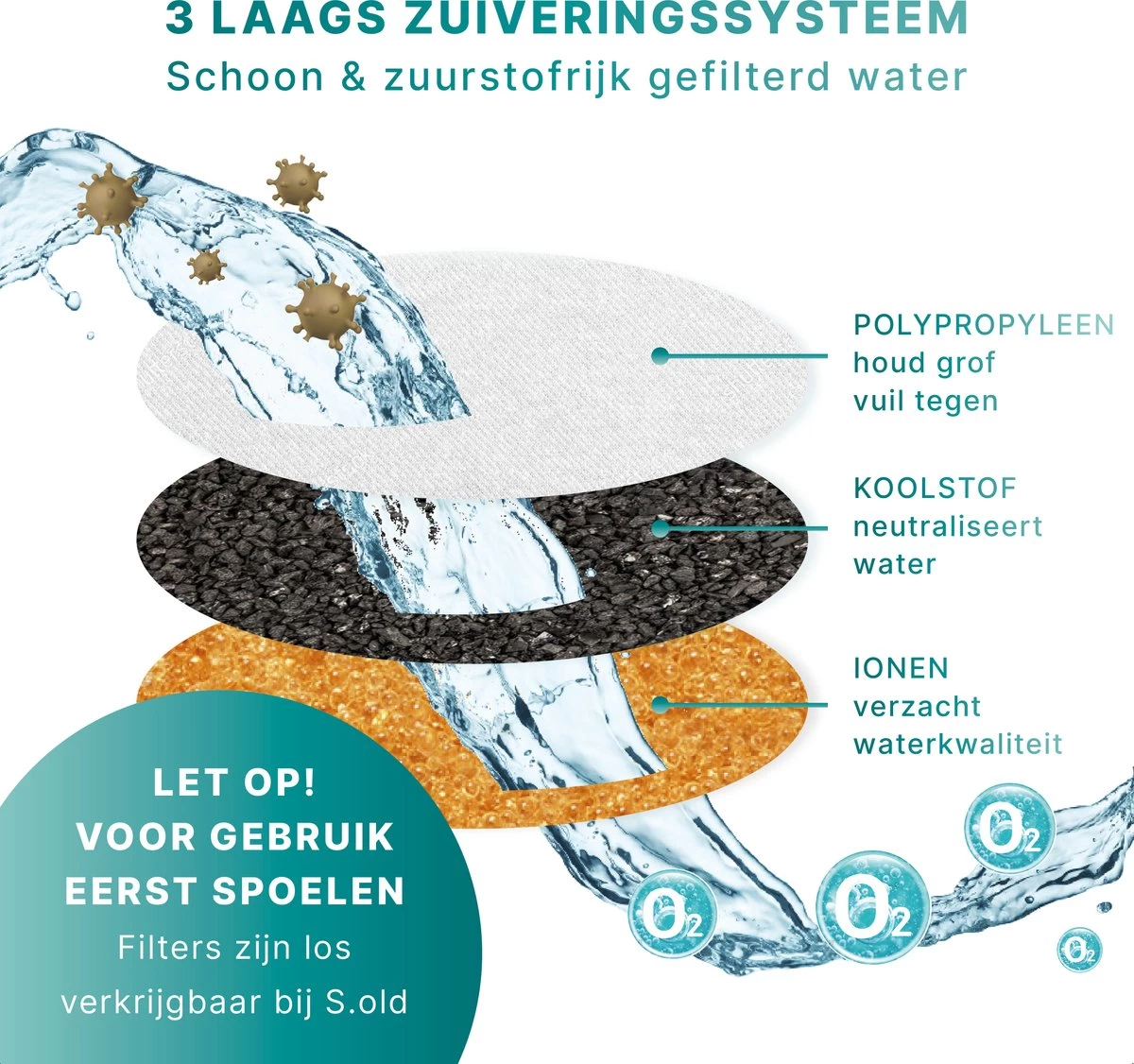 Bij gebruik van een nieuw filter dient deze eerst omgespoeld te worden met water voordat je deze gebruikt, dit om losse koolstofdeeltjes weg te spoelen en verkleuring van het water te voorkomen.