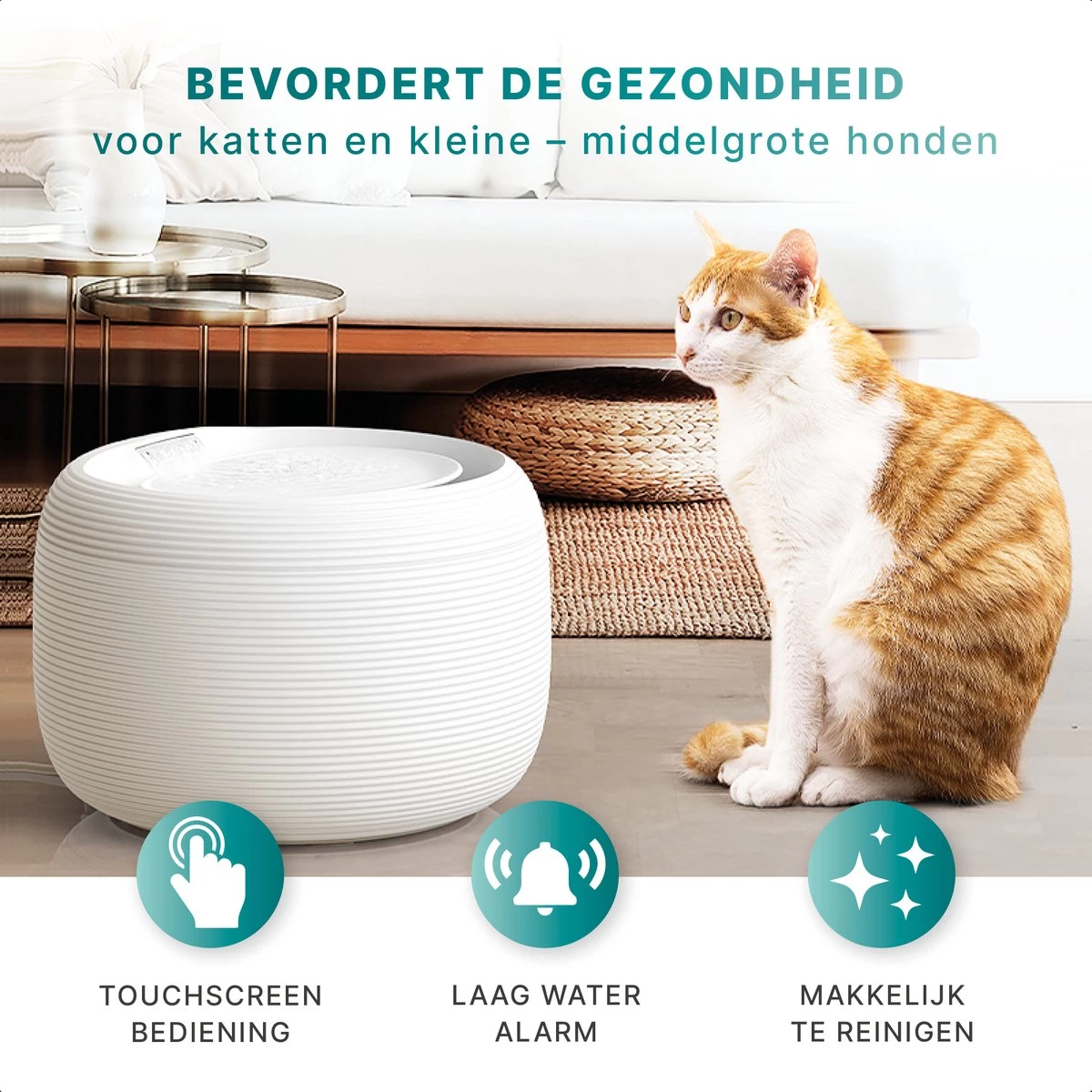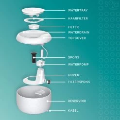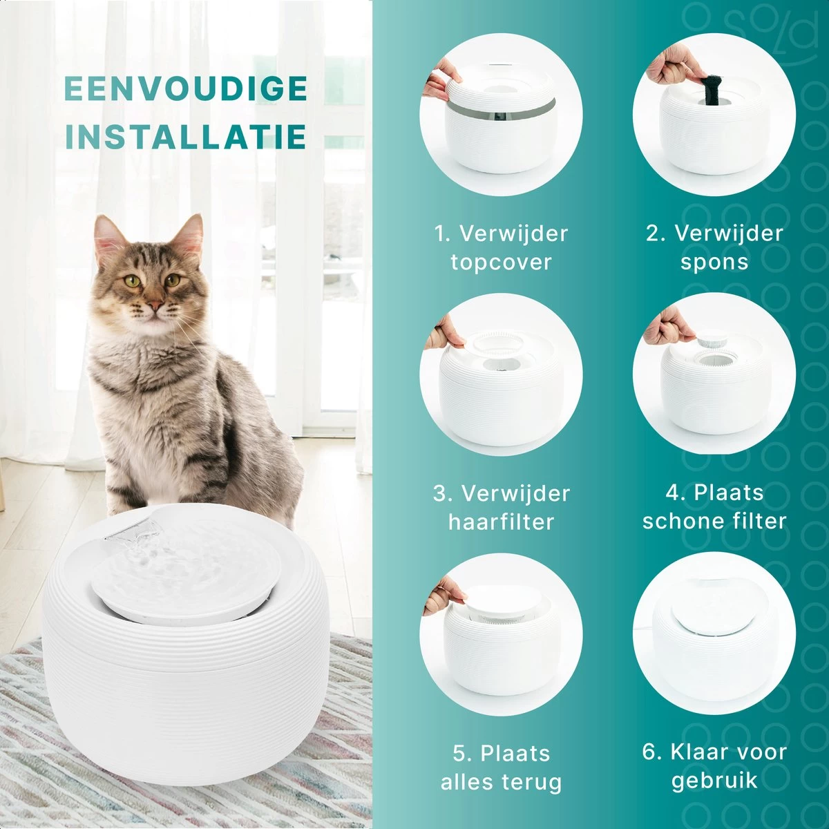 De drinkfontein is uitgerust met een drievoudig filtersysteem welke het water in optimale conditie houdt. De pomp zorgt voor een constant circuleren van het water en het filtersysteem filtert haren, vuil, nare geuren en smaken uit het water en maakt het water zachter wat kalkvorming voorkomt. Bij aanschaf van de drinkfontein worden 2 filters meegeleverd welke bij dagelijks gebruik circa 1 maand meegaan. De fontein is BPA-vrij en gemaakt van milieuvriendelijk materiaal.