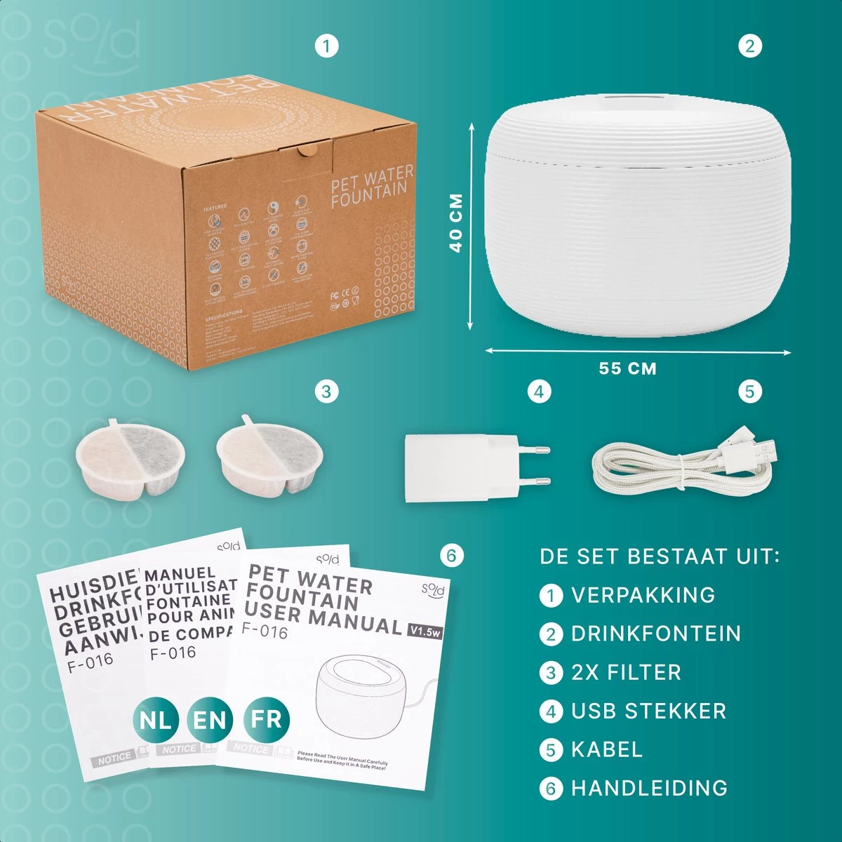 Wil jij ook een drinkfontein die mooi in je interieur past én een bijdrage levert aan de gezondheid van jouw huisdier? Met deze stijlvolle drinkfontein van S.old stimuleer je de drinkbehoefte van jouw huisdier. Met een inhoud van 2,5 liter is deze drinkfontein te gebruiken voor katten en kleine tot middelgrote honden. Het drievoudige filtersysteem en de waterpomp houden het water schoon en zuurstofrijk. De drinkfontein is fluisterstil, heeft een laag energieverbruik en energiebesparende stand en is eenvoudig in gebruik.