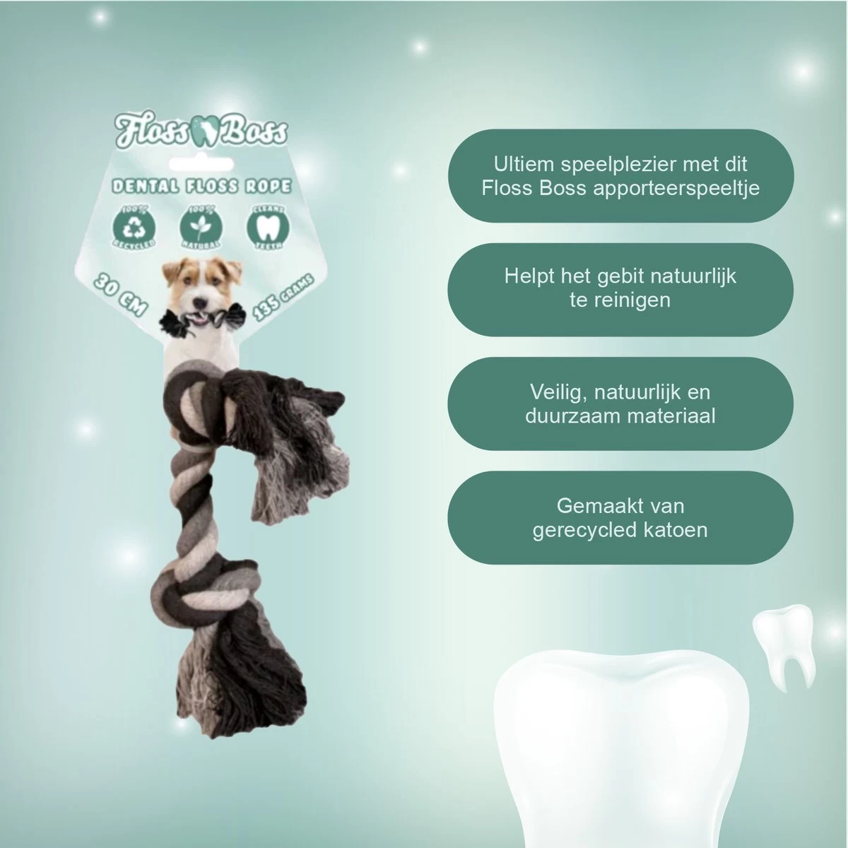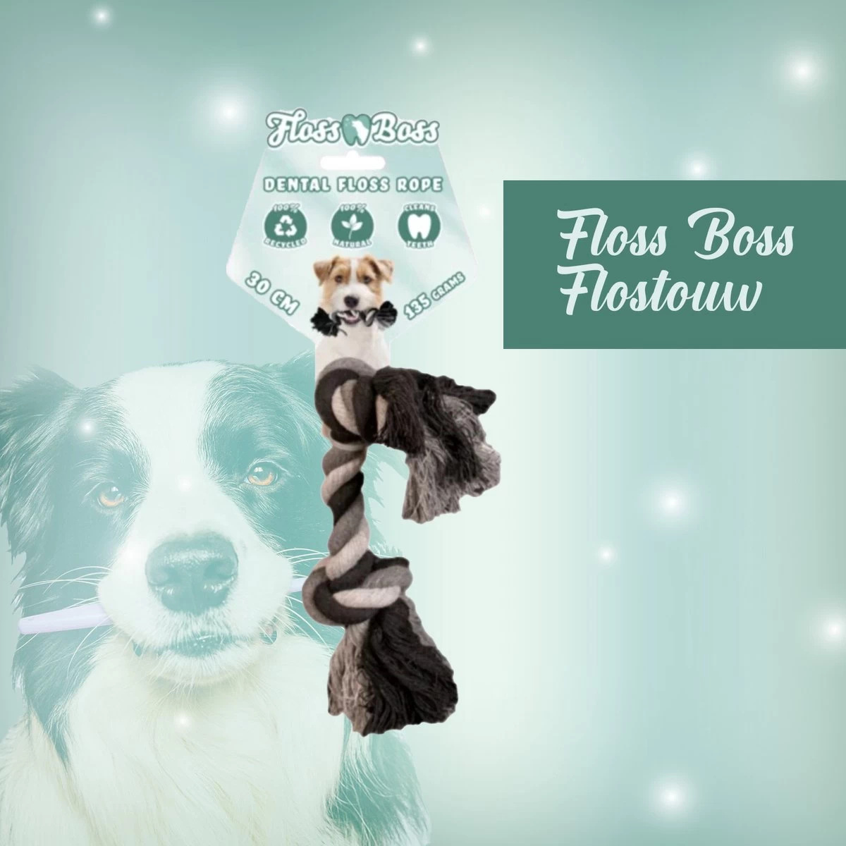 Het stevige flostouw wordt uitsluitend gemaakt van gerecycled katoen. Hierdoor is de aanschaf van een Floss Boss niet alleen een goede keuze voor uw hond, maar ook voor het milieu.