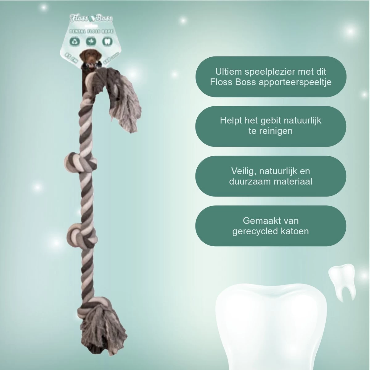 Het stevige flostouw wordt uitsluitend gemaakt van gerecycled katoen. Hierdoor is de aanschaf van een Floss Boss niet alleen een goede keuze voor uw hond, maar ook voor het milieu.
