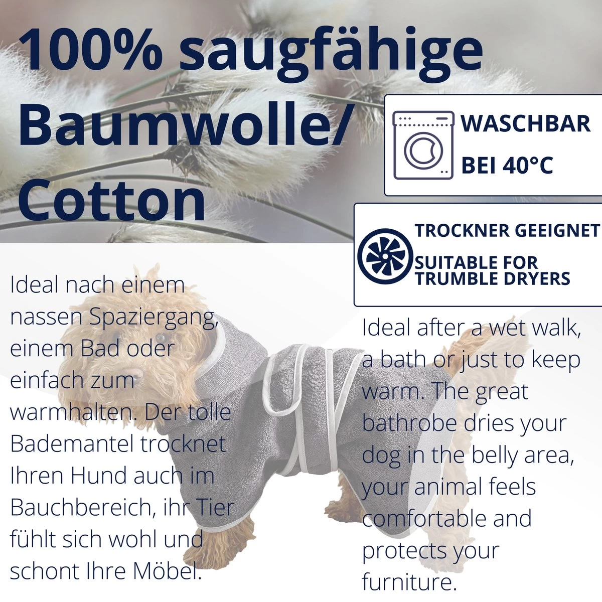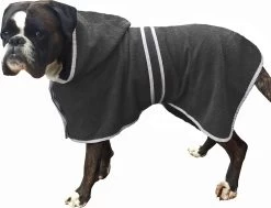 - DETAILS: De absorberende hondenjas is gemaakt van 100% katoen. Dit materiaal is uitermate zacht en absorbeert het water en vocht snel. De badjas is beschikbaar in verschillende maten voor zowel grote als kleine honden.