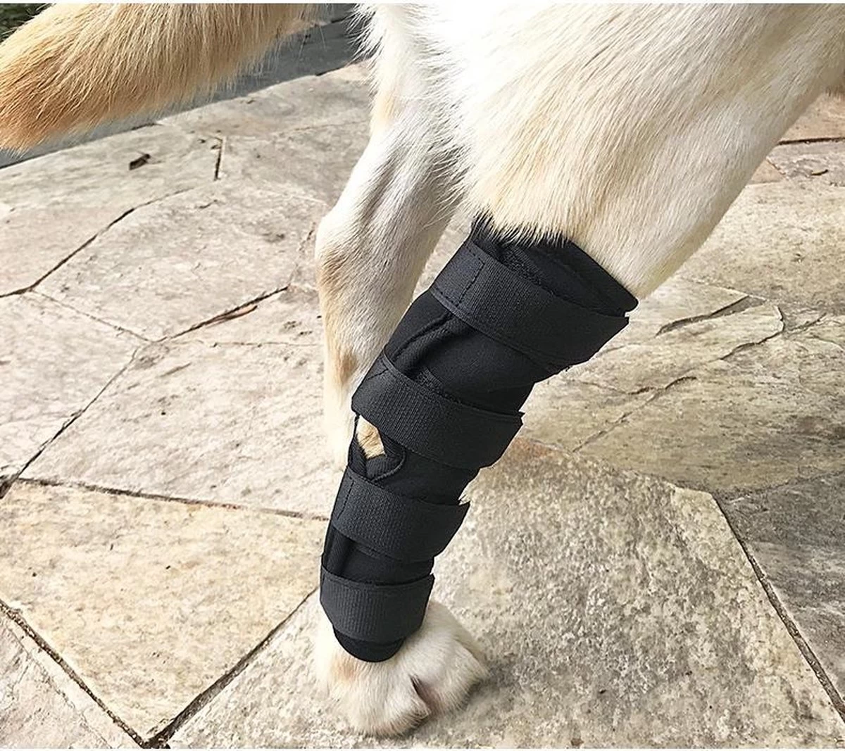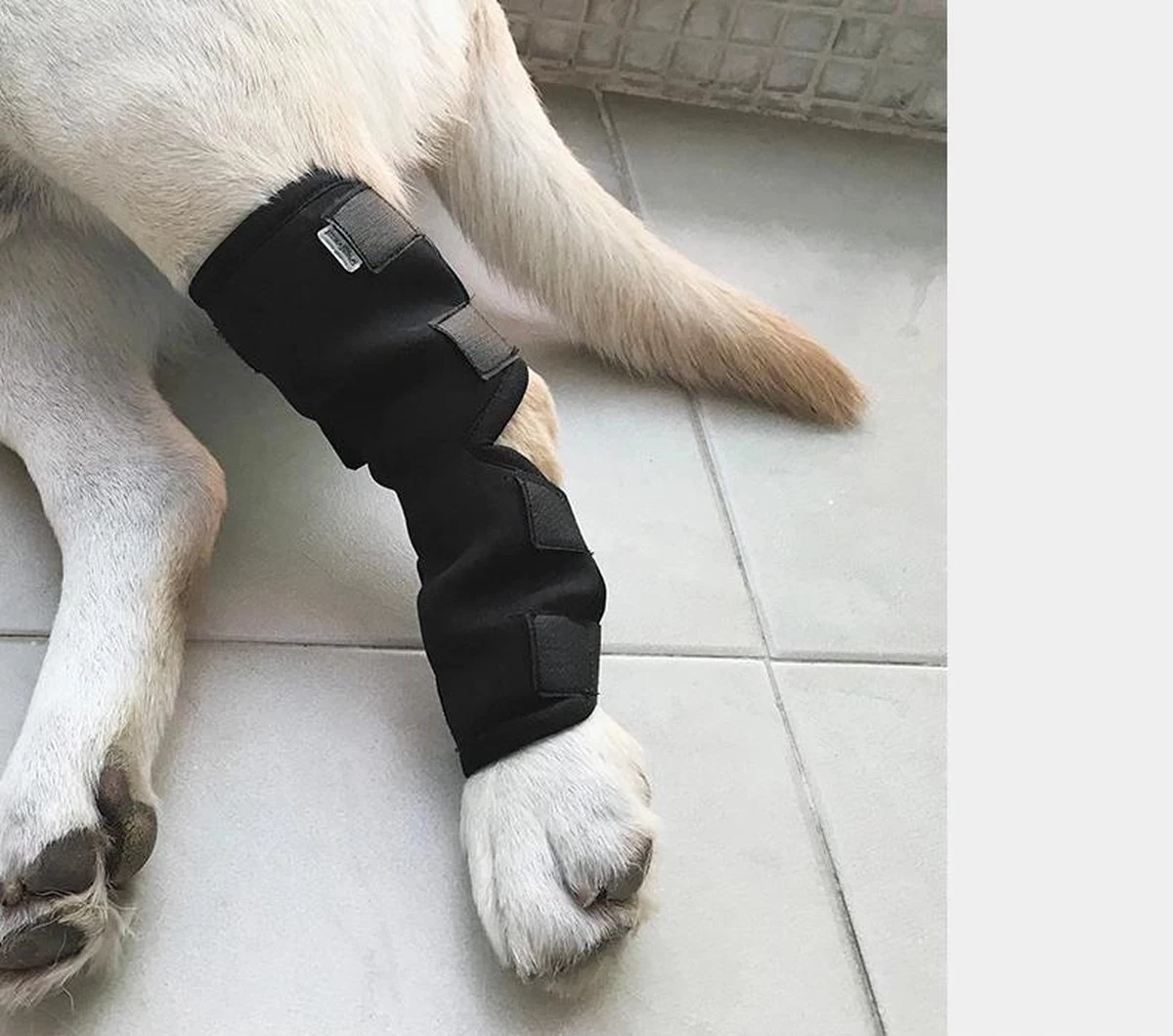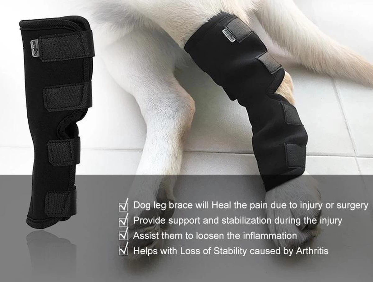 De brace is sterk steungevend en beschermt de hond zijn gewrichten.