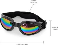 De elastische band van de bril is aan de zijkanten volledig verstelbaar voor een comfortabele pasvorm voor uw hond. Het ‘montuur’ zelf is echter beter geschikt voor middelgrote en grotere hondenrassen.