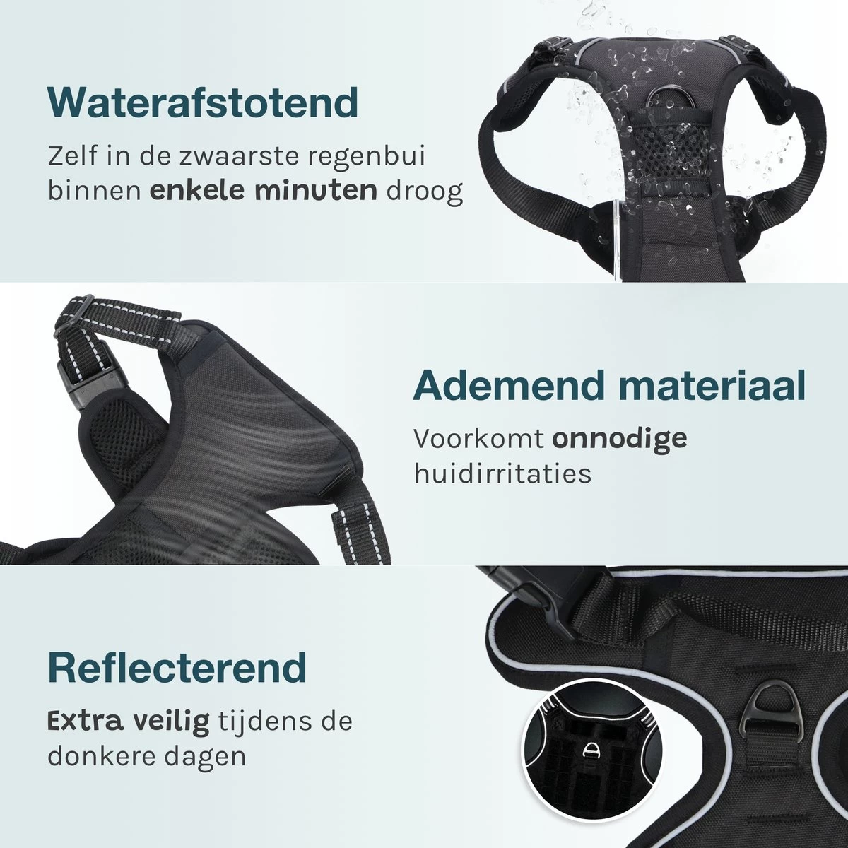 Hondenweer? Met ademend mesh materiaal & stevig nylon maak jij je geen zorgen. Ons hondentuigje is goed bestand tegen water en razendsnel droog zodat je ook in de regen kunt lopen.