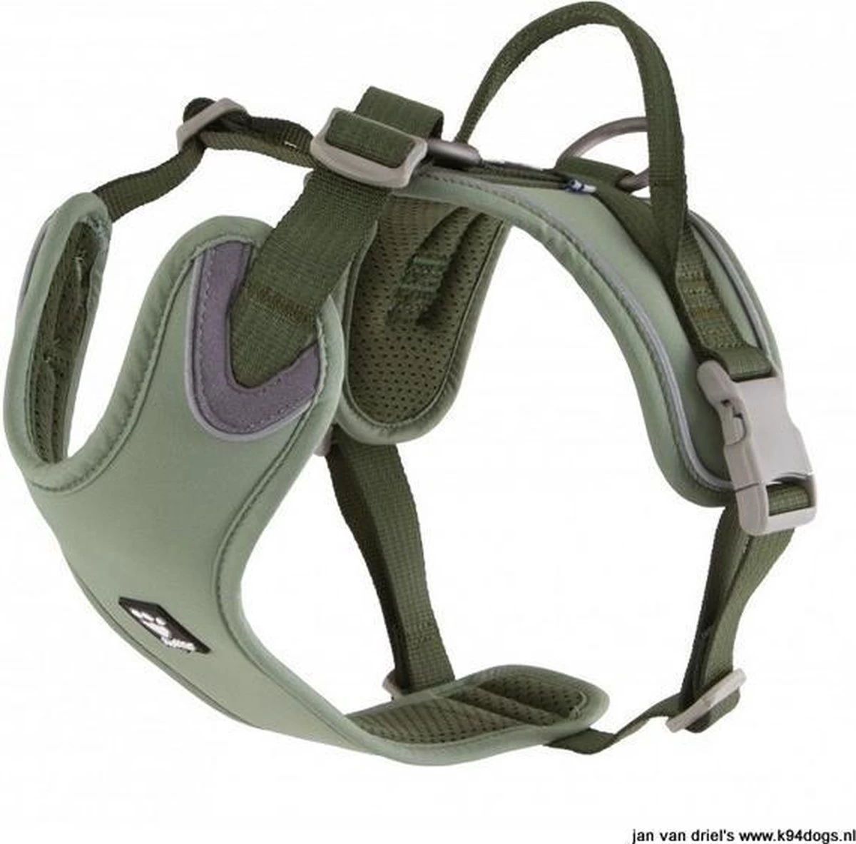 Hurtta hondentuig. model Y harness van de serie weekend warrior ECO. Kleur ‘Hedge’ mosgroen. Een comfortabel neopreen hondentuig gemaakt volgens Fins design. goede pasvorm. Soepel en stevig borststuk voor een goede drukverdeling. Zeer geschikt voor lange wandelingen en sport. Het tuig is voorzien van een handgreep op de rug zo is de hond gemakkelijk even vast te houden bij het in en uit de auto stappen of tijdens de wandeling. Bovenop het tuig zit een stevige gelaste ring om de hondenriem aan te bevestigen. een reflecterende bies rondom het boven dekje op het tuig zorgt ervoor dat U goed zichtbaar bent tijdens de avond wandeling. Het tuig is geheel gevoerd. Rondom de hals is het goed verstelbaar en een poot optillen om het tuig aan te trekken is niet nodig. twee sterke, op veiligheid geteste kliksluitingen aan beide kanten van het tuig maken het heel gemakkelijk om het tuig aan te doen. Dit is het mosgroene Hurtta hondentuig voor grote rassen met een omvang van 80 tot 100 cm