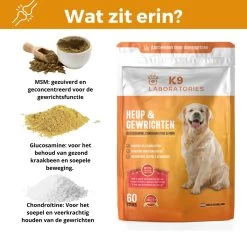 K9 Laboratories Heup & Gewrichten. 100% natuurlijk supplement voor honden met ED, HD, artrose, mankheid en stijve gewrichten. Ontwikkeld i.s.m. dierenartsen.