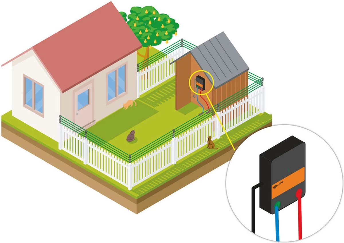 De ideale startersset voor een effectieve omheining (voor katten), voor gebruik op of bovenop een bestaande houten omheining. De set bevat alle belangrijke onderdelen voor een elektrische afrastering van 50 m (uitbreidbaar tot 500 m). Ideaal om uw huisdieren in de tuin te houden. De omheiningsset is gemakkelijk te installeren en zeer doeltreffend in gebruik. Het werkt als een +- systeem, een impuls wordt alleen gegeven zodra de kat twee draden tegelijk aanraakt. Daarom moeten twee draden tegelijk worden aangeraakt om de impuls te voelen. Dit systeem heeft geen aparte aardpen nodig!
