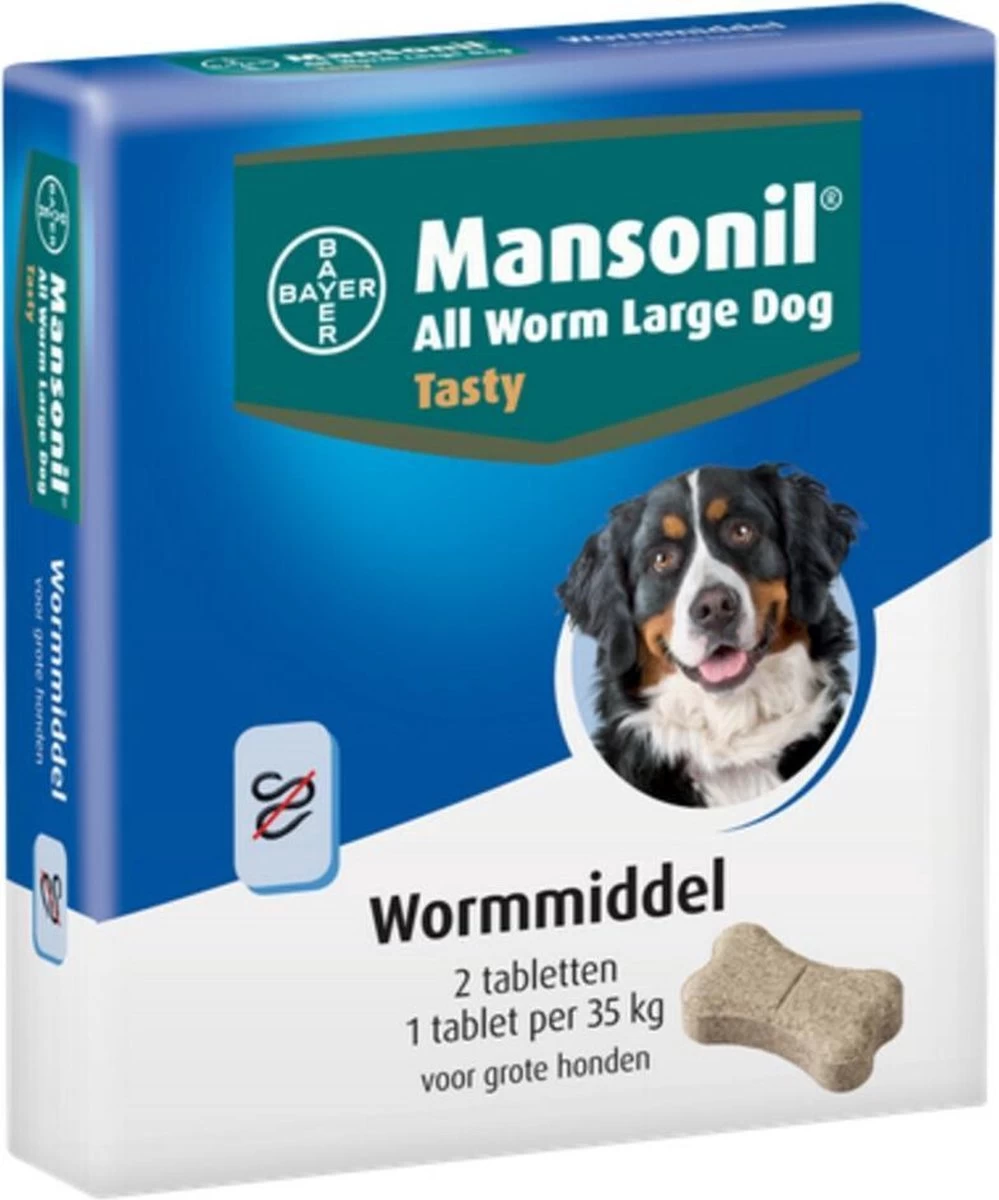 Mansonil All Worm Large Dog Tasty is een ontwormingsmiddel met een brede werking. Het doodt de belangrijkste rond- en lintwormen die bij de hond voorkomen na een éénmalige behandeling.