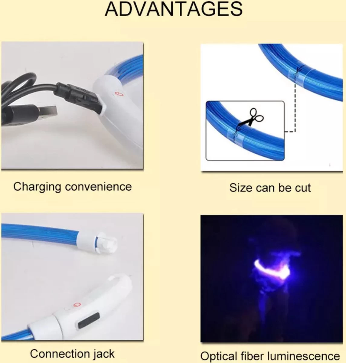Deze halsband heeft een led verlichting die tot op een afstand van 500m zichtbaar is. De lampjes kunnen ingesteld worden in verschillende standen : continu branden, langzaam knipperen, snel knipperen of gewoon uit. In de halsband zitten een aan/uit knop en een USB-ingang om hem op te laden.