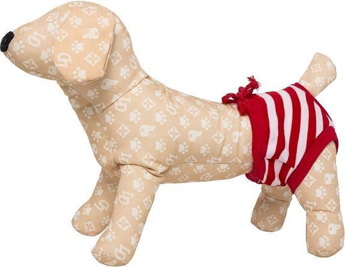 Dit gestreepte loopsheidbroekje voor de hond is verkrijgbaar in verschillende kleuren en maten. De maat is afhankelijk van de buikomtrek van de hond.