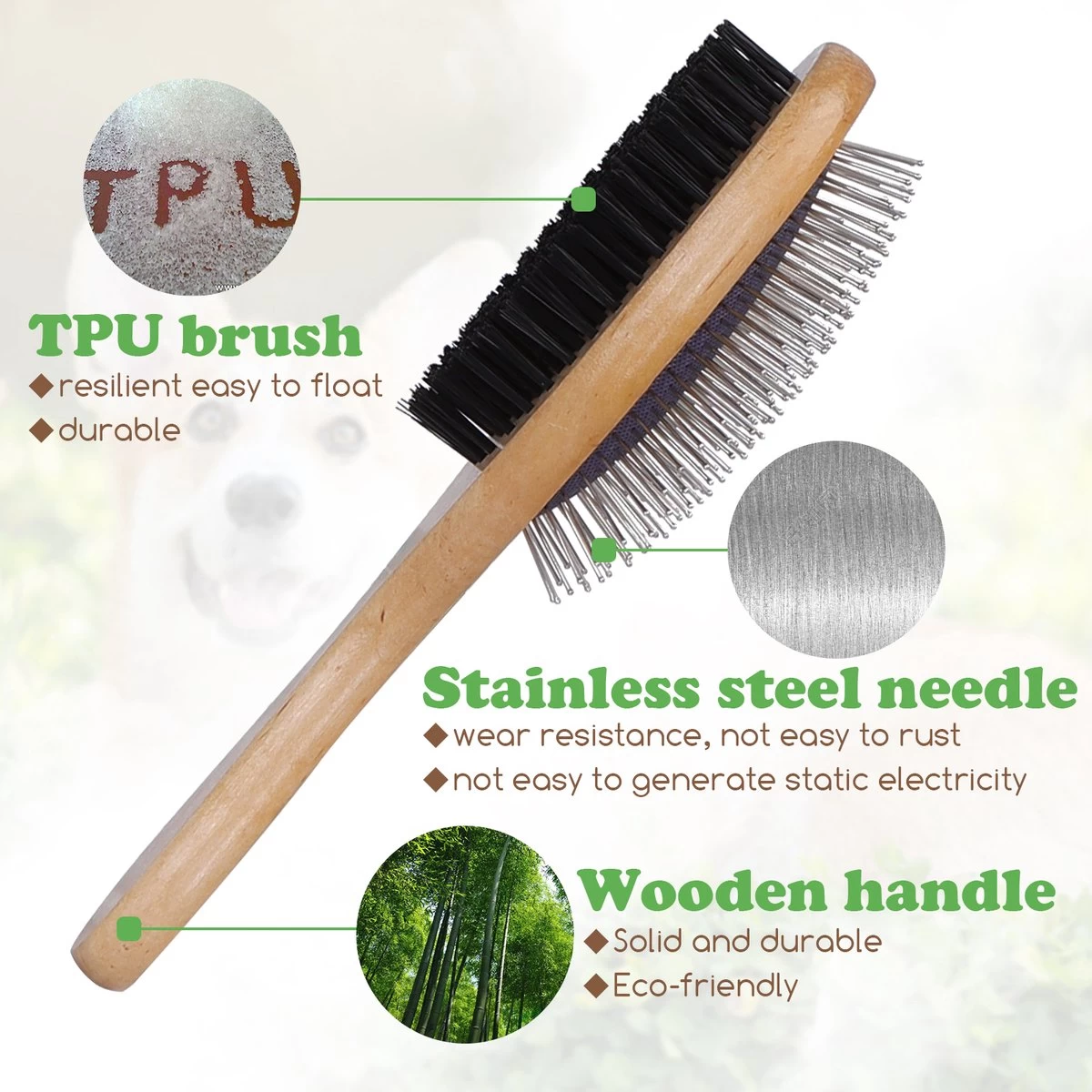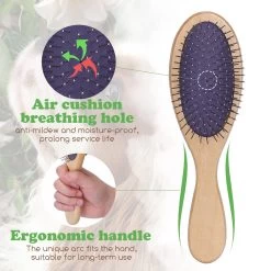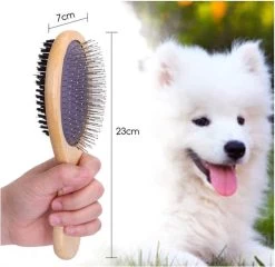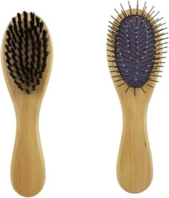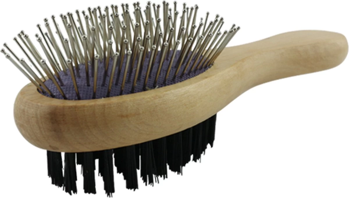 Combi borstel van hout voor het verwijderen van klitten en kammen van de vacht. Het poetsdeel zorgt voor een goede doorbloeding en geeft een mooie glans aan de vacht. Geschikt voor honden en katten.