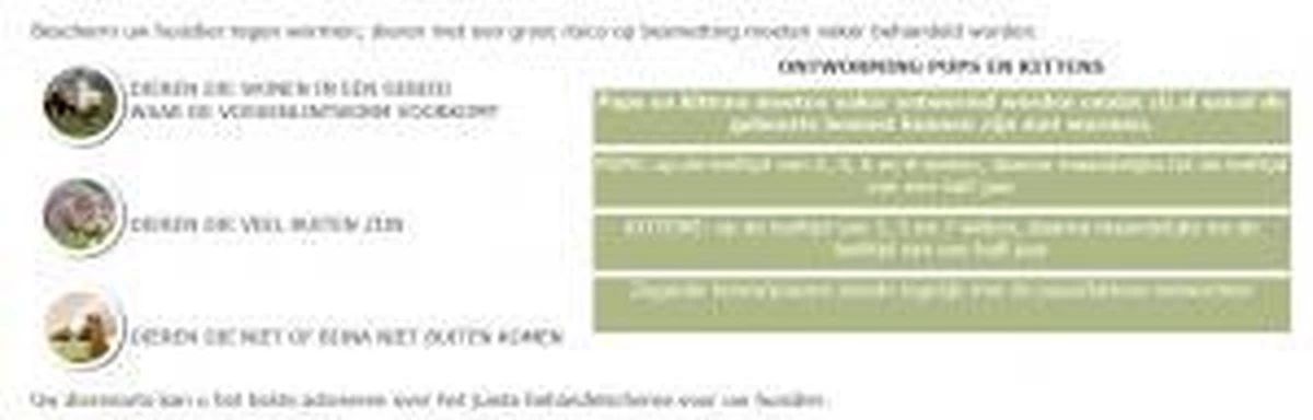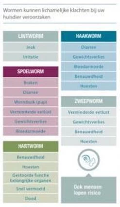 | Bestrijding van type worm | Zweepwormen / Spoelwormen / Lintwormen / Hartwormen / Haakwormen |