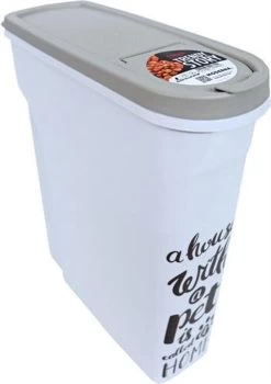 Moderna Voercontainer Trendy Shorty Pet Wisdom 5 litr is een kusntstof opbergcontainer voor dierenvoeding, met verwijderbare bovenkant en deksel en leuk design. Deze voercontainer is uitgevoerd in neutraal, modern wit met een bovenkant van taupe, die luchtdicht afsluit om het voer van jouw viervoeter zo lang mogelijk vers te houden. Het voer is bereikbaar door het klepjes bovenop, maar ook kun je de gehele bovenkant verwijderen om de containter gemakkelijk te kunnen vullen. Om het af te maken is de voercontainer bedrukt met de tekst ‘A house with a pet is called a home’ in zwarte design-letters.