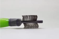 De borstel heeft een praktisch gelhandvat dat zich vormt naar je hand. Als hier haar op achterblijft na het kammen, dan kan je dit eenvoudig reinigen met een vochtige doek of onder de kraan.