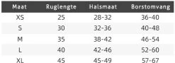 Maat XS: Rug: 25cm Borst: 36-40cm Nek: 28-32cm
