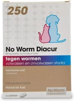 De werkzame stof Fenbendazol doodt na toediening de spoel-, lint-, haak- en zweepwormen in het lichaam van jouw hond of kat. Daarnaast is de No Worm Diacur PetPaste geregistreerd tegen de Giardia parasiet. No Worm Diacur is een wormenkuur voor puppy’s, kittens en volwassen honden en katten. De ontwormingstablet(ten) en/of de ontwormingspasta dienen drie dagen opeenvolgend gegeven te worden. Een wormenbesmetting kan je helaas niet voorkomen, maar door minimaal 4x per jaar te ontwormen kun je een ernstige wormeninfectie voorkomen.