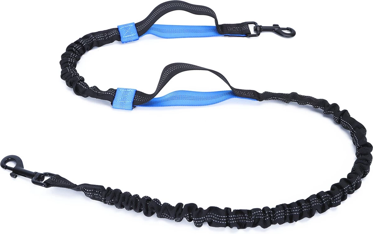 - De elastische hondenriem is voorzien van musketonhaken aan beide uiteinden voor het gemakkelijk aanhaken aan heupriem en halsband van uw hond.