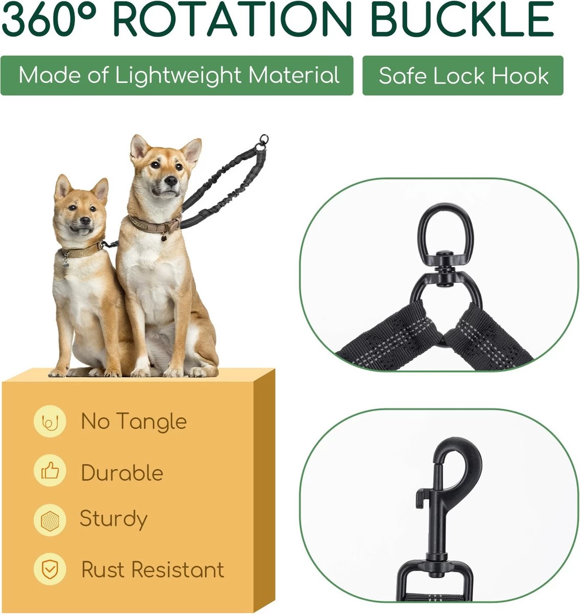 Dit type hondenriemen is eenvoudig aan de draaibare O ring te haken en de twee musketonhaken zijn eenvoudig aan de halsbanden te klikken.