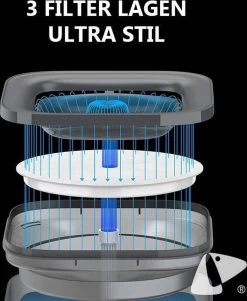 Het drievoudige circulatiesysteem zorgt ervoor dat het water constant in beweging blijft. Dit zorgt voor maximale oxygenatie van het water. Daarnaast wordt het water bij iedere circulatie door de slimme filter heen gespoeld. De filter is samengesteld uit maar liefst 3 lagen bestaand uit; katoen, actieve kokosnoot kool en een ionenwisselaar wat ervoor zorgt dat uw trouwe viervoeter alleen het zuiverste water binnenkrijgt. Dit zorgt voor het gezondste leven van uw huisdier en dat is uiteindelijk wat we allemaal willen.