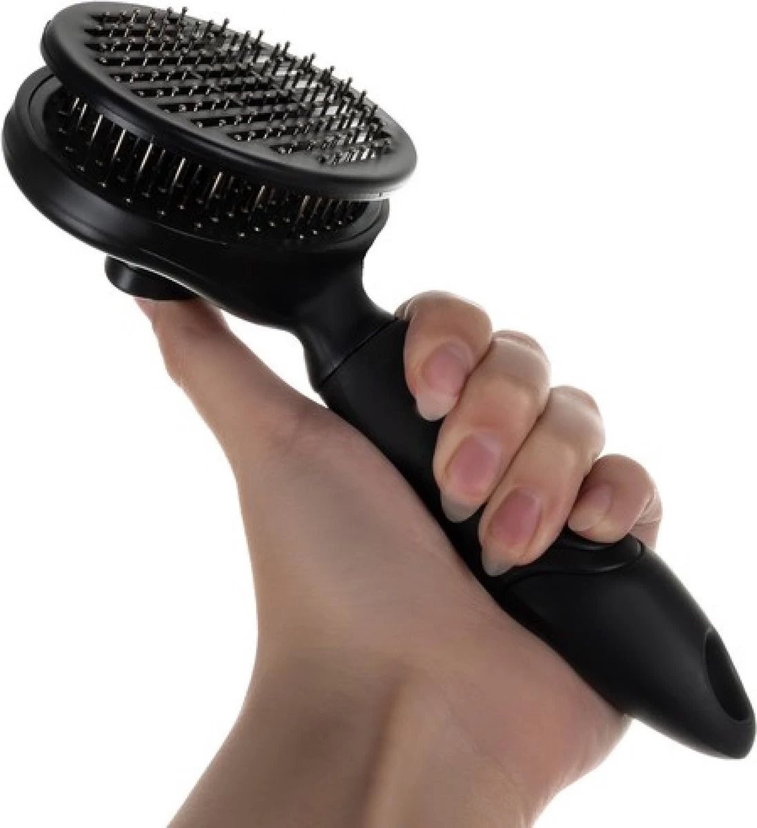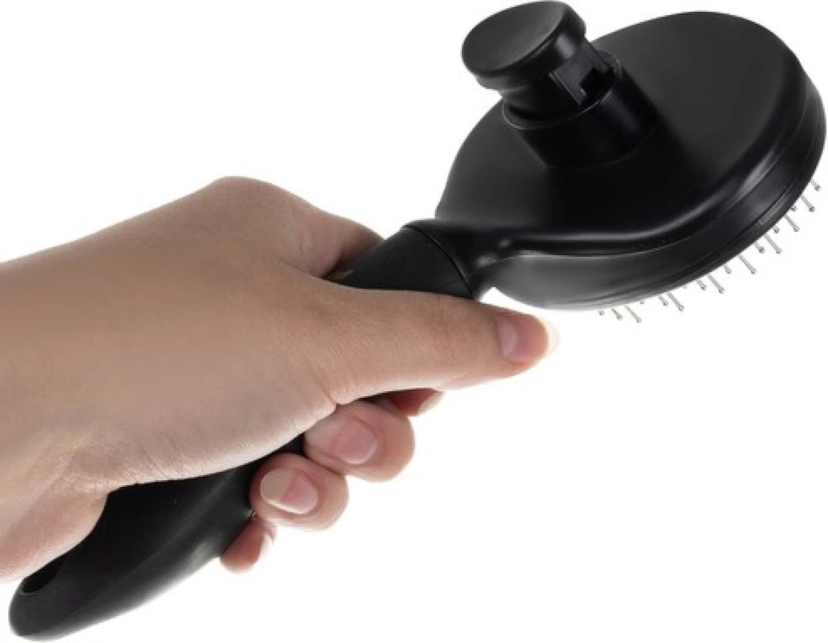 - ZELFREINIGEND – de borstel is zelfreinigend, dankzij de handige knop verwijdert hij effectief en snel haar van de naalden. Het is een erg handige oplossing bij het kammen van een dier, want u hoeft de haren niet uit te trekken tijdens het borstelen, gebruik gewoon de handige knop en de vacht komt vanzelf omhoog.