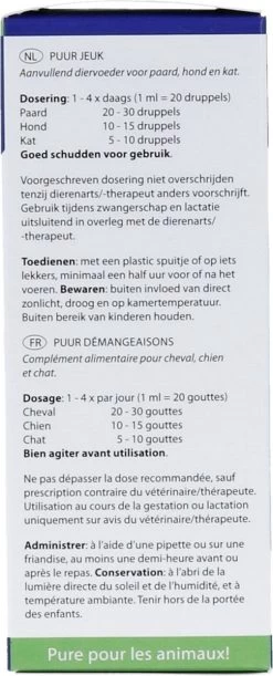 Puur Jeuk kan zonder bezwaar in combinatie met geneesmiddelen worden gebruikt.In een enkel geval kan in het begin van het innemen van de druppels een onschuldige en kortdurende verergering van de klachten voorkomen. Dit geeft aan dat het dier intensief op het middel reageert. Indien deze verergering hinderlijk is, dient u de geadviseerde dosis voor uw dier te halveren of een keer een dosis over te slaan. Mocht u een bijwerking menen te constateren, verzoeken wij u deze te melden bij uw dierenarts of –therapeut._x000D_