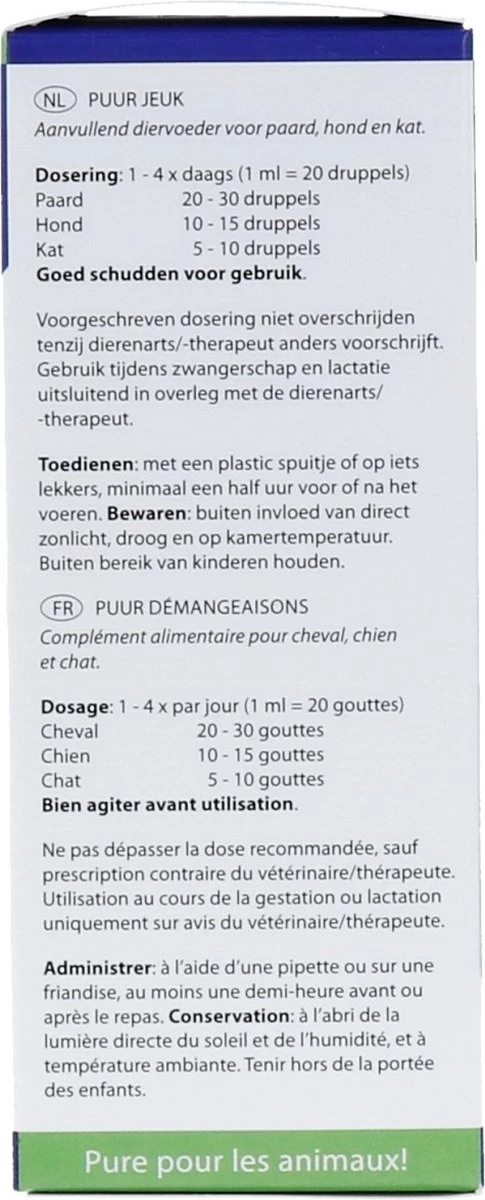 U dient het middel PUUR Jeuk minimaal 3 weken achtereen te geven. Dit product kan worden gecombineerd met PUUR Drainage._x000D_