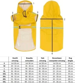 Er zijn 8 maten beschikbaar. Het maakt niet uit of uw hond een Chihuahua of een enorme Sint-bernard is, onze regenjas past! We raden bij twijfel altijd aan om 2 maten te bestellen, zodat u altijd tot de juiste maat voor uw viervoeter kan komen.