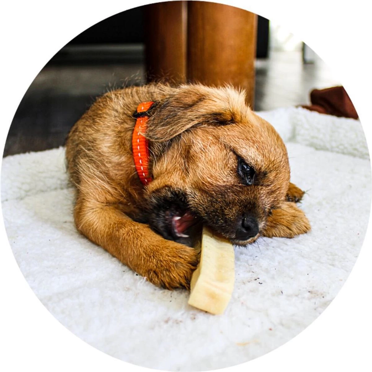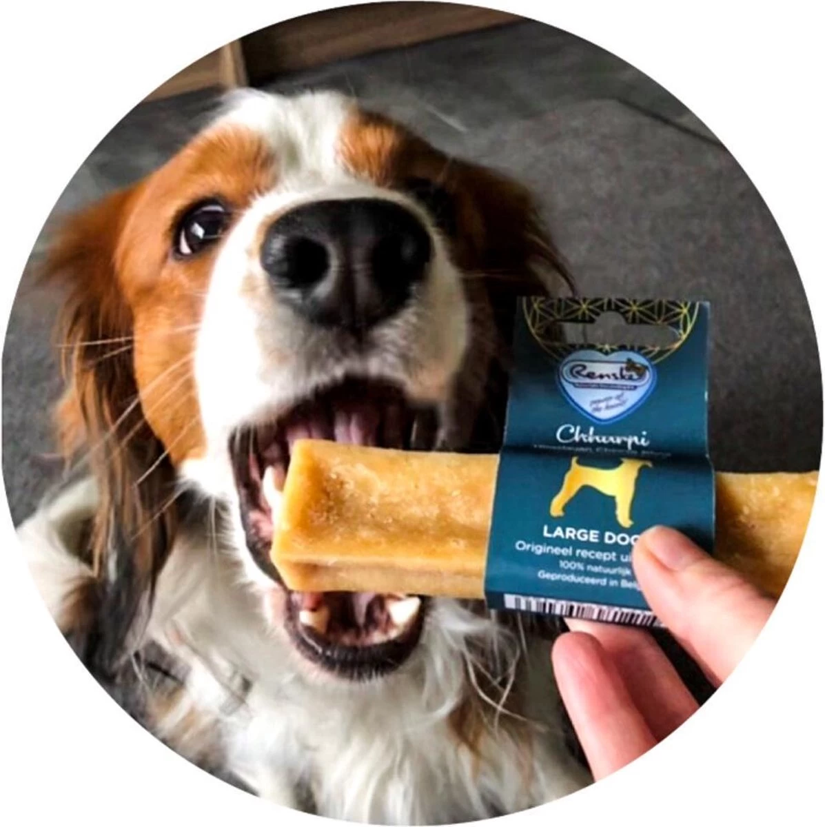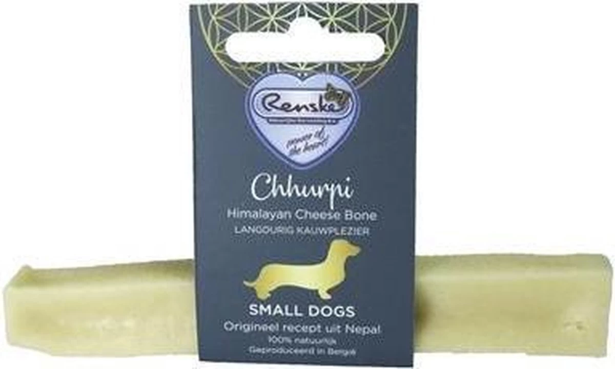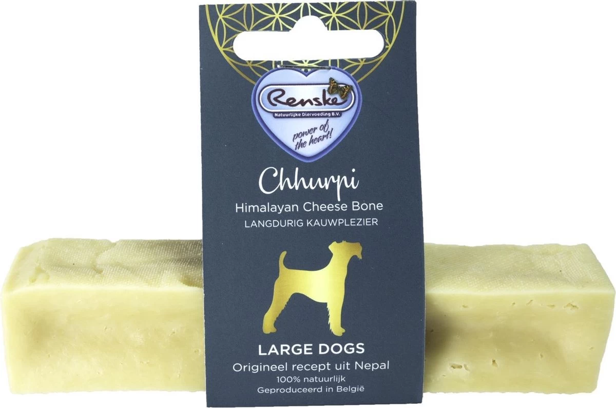 De Renske Chhurpi Kauwkluif L 90 gr is een natuurlijke hondensnack van kaas, gebaseerd op een recept uit de Himalaya zonder gluten en granen. Een gezonde beloning waar jouw hond lekker een tijdje zoet mee is. Deze snack is gemaakt op basis van een eeuwenoud recept uit de Himalaya, dat enkel gebruikt maakt van melkproducten. Geen granen of gluten dus! Jouw hond zal graag kauwen op deze natuurlijke kaassnack, wat helpt bij de verzorging van het gebit en verveling tegengaat. Dat maakt dit de ideale traktatie of beloning voor jouw hond. Tip: verwarm het laatste stukje van de Chhurpi in de magnetron voor een heerlijke, gepofte kaassnack.