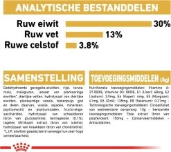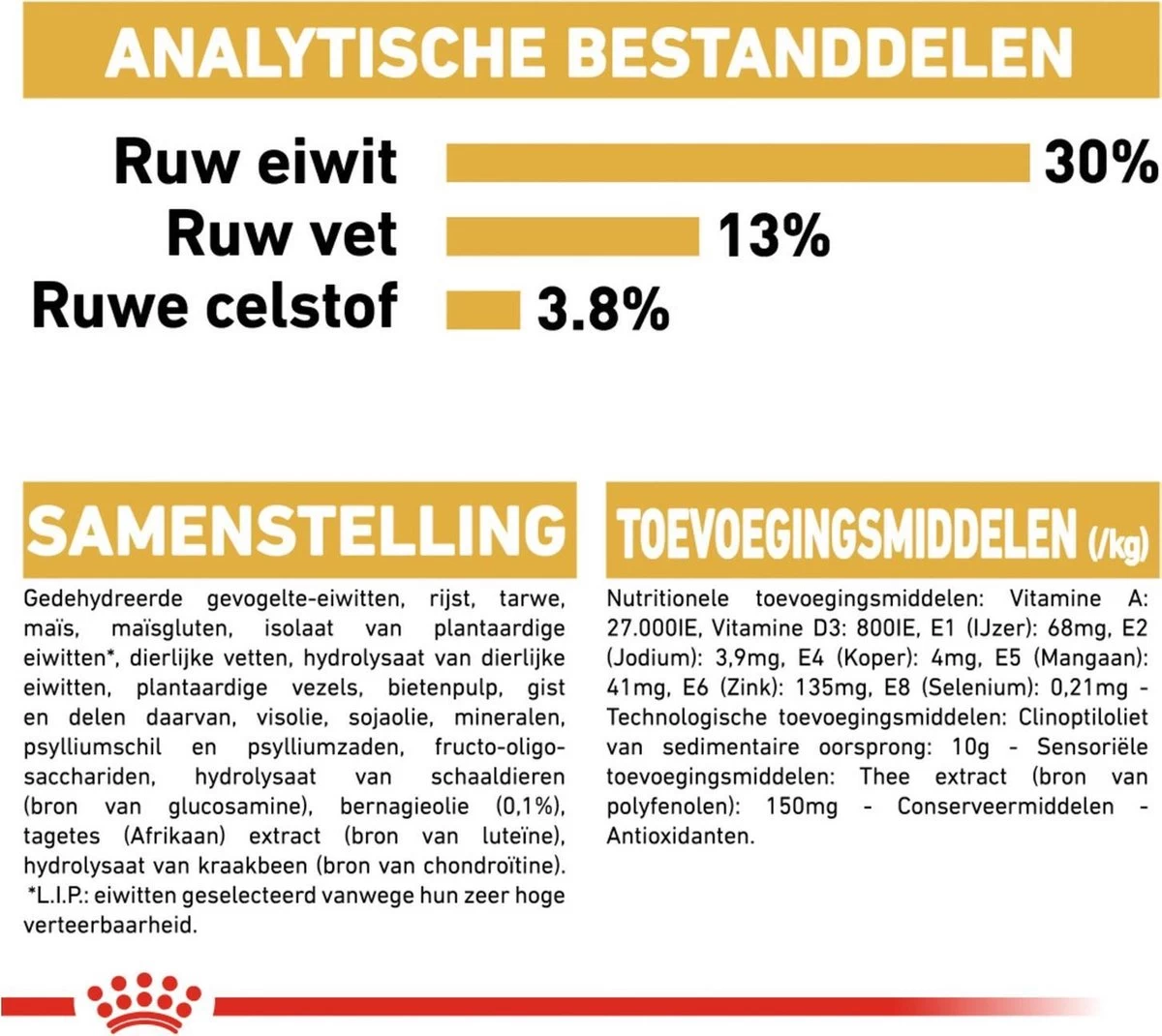| Voedingswaarde | Samensteling: rijst, maïs, gedehydreerd runder- en varkenseiwit*, gedehydreerde gevogelte-eiwitten, maïsgluten, dierlijke vetten, hydrolysaat van dierlijke eiwitten, plantaardige vezels, mineralen, bietenpulp, gist, visolie, sojaolie, psylliumschil en psylliumzaden, Fructo-Oligo-Sacchariden, hydrolysaat van schaaldieren (bron van glucosamine), bernagieolie (0,1%), extracten uit groene thee en druiven (bron van polyfenolen), tagetes (Afrikaan) extract (bron van luteïne), hydrolysaat van kraakbeen (bron van chondroïtine) |