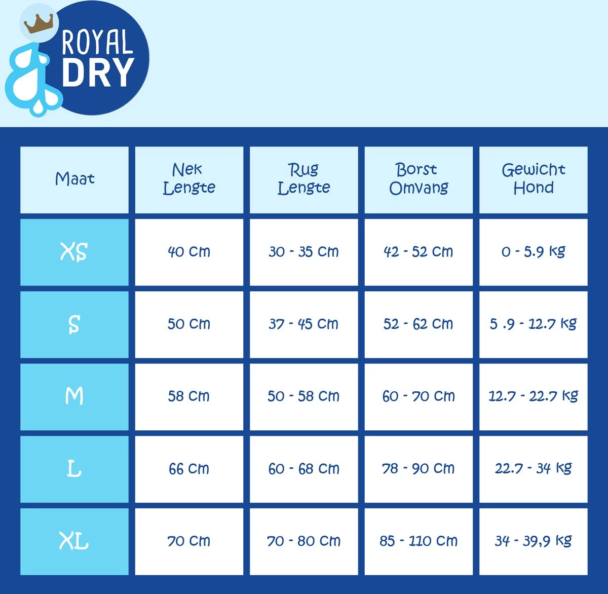 Deze Royal Dry badjas is een heerlijk warme badjas voor jouw hond en is super comfortabel en zacht. De Royal Dry badjas zuigt water en vuil op als een spons, is extreem duurzaam en superzacht. De Royal Dry badjas droogt snel, neemt geen geuren op en is antibacterieel.