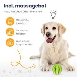 De rubberen massage bal kan gevuld worden met hondensnoepjes en helpt net als de snuffelmat het schrok gedrag van je hond te verminderen. De inkepingen in de rubberen bal zorgen er voor dat het tandvlees spelenderwijs wordt gemasseerd en vermindert de vorming van tandplak.