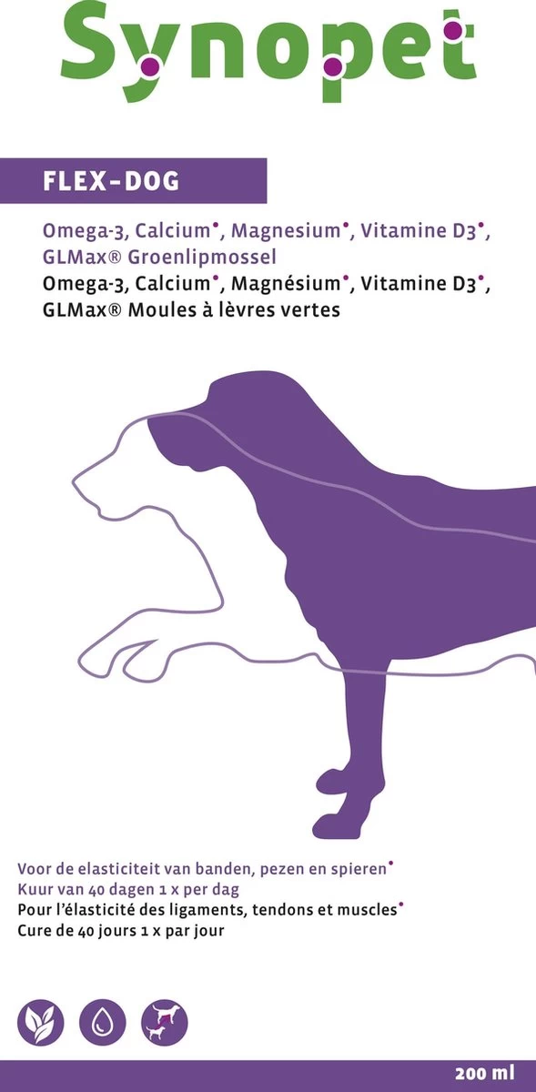 Flex-Dog is een boost voor pezen en spieren van honden. Het ondersteunt de soepelheid. Honden spelen graag, rennen veel, springen in de lucht, stoppen abrupt of maken ineens een kleine bocht. Te strakke of juist te losse pezen en spieren kunnen bij een hond tot (langdurige) blessures leiden.