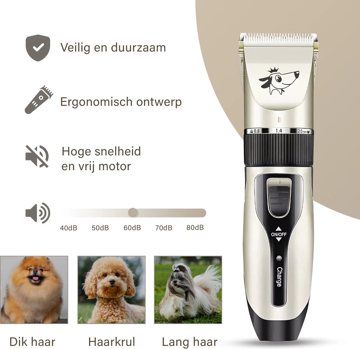 + Hoge kwaliteit– Met opzetstukken varierend van 3 tot 12 milimeter en een tondeuse met een kracht van 1000 mA kan dit product de haren van vrijwel elke hond aan.