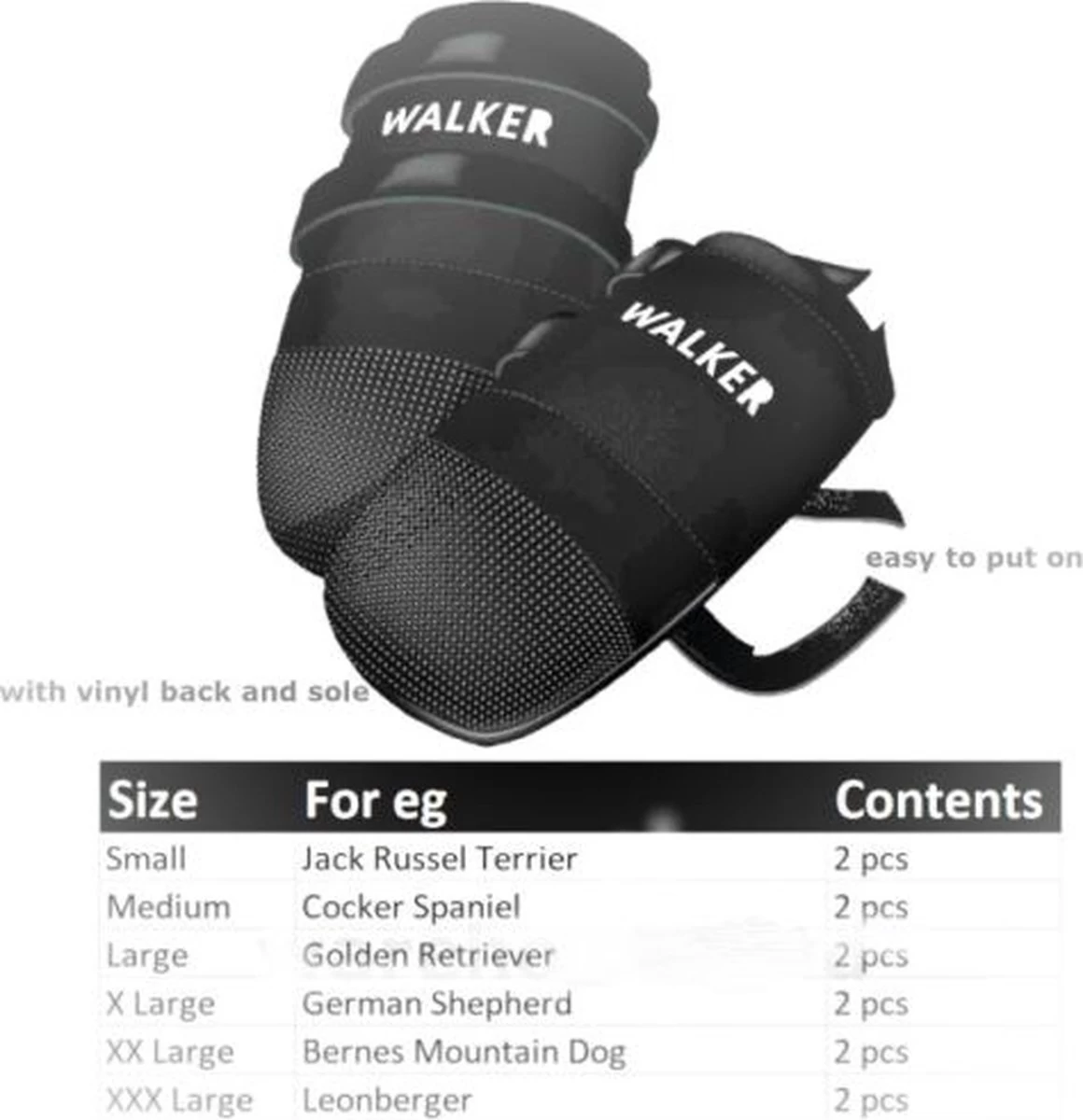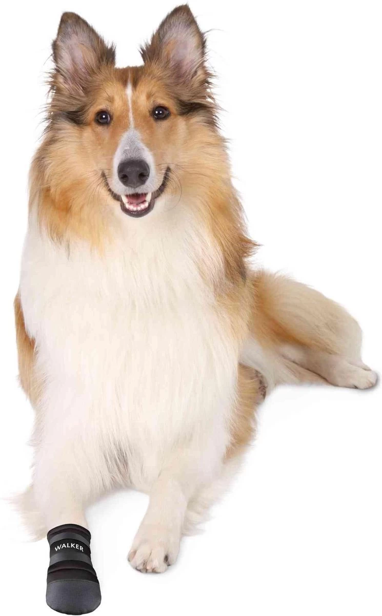 Deze polyester schoenen zorgen ervoor dat vuil niet in sneetjes, kloven of wondjes in de voetzolen van jouw hond kan dringen. De schoen is van zacht doch stevig materiaal en is vast te maken met een klittenbandstrook. Doordat je de wijdte kan verstellen met het klittenband, zit het schoentje nooit te strak om het pootje van jouw lieve viervoeter.De achterkant en de zool van de schoenen zijn van vinyl waardoor ze tegen een stootje of een wandeling op straat kunnen. Materiaal: polyester en vinylKleur: zwartInhoud: 2 stuksAfmeting: ca. 18×9 cmGeschikt voor honden ter grootte van een Golden retrieverDeze schoenen zijn verkrijgbaar in verschillende maten.