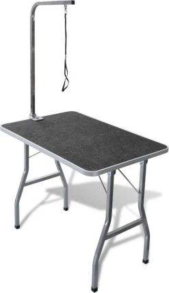 De verzorgingstafel is perfect voor trimmers die thuis of elders, bijvoorbeeld bij hondenshows, dieren willen verzorgen. De trimtafel beschikt over een anti-slip tafelblad en een gepoedercoat ijzeren frame met een verstelbare trimarm en aanlijnlus. Deze professionele trimtafel is veelzijdig en maakt iedere trimsituatie comfortabeler. Het tafelblad van de hondentafel is voorzien van een anti-slip laag, met oog op de veiligheid van je huisdier terwijl deze op de tafel staat. De aanlijnoptie is in hoogte verstelbaar en eenvoudig af te koppelen na gebruik, de trimtafel is gemakkelijk op te bergen dankzij het inklapbare onderstel. Bovendien neemt de trimtafel weinig ruimte in beslag wanneer u deze na gebruik weer opbergt. De tafel is met zijn ergonomische ontwerp in zijn geheel in hoogte verstelbaar. Levering bevat 1 x trimtafel, 1 x aanklembare aanlijnarm en 1 x aanlijnlus.