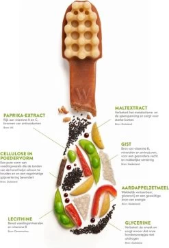 | Voedingswaarde | Aardappelzetmeel, glycerine, gepoederde cellulose, lecithine, gist, maltextract, lupine, alfalfa extract en paprika |