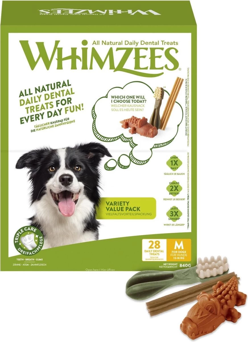 De Whimzees Variety Box M bevat 28 snacks.